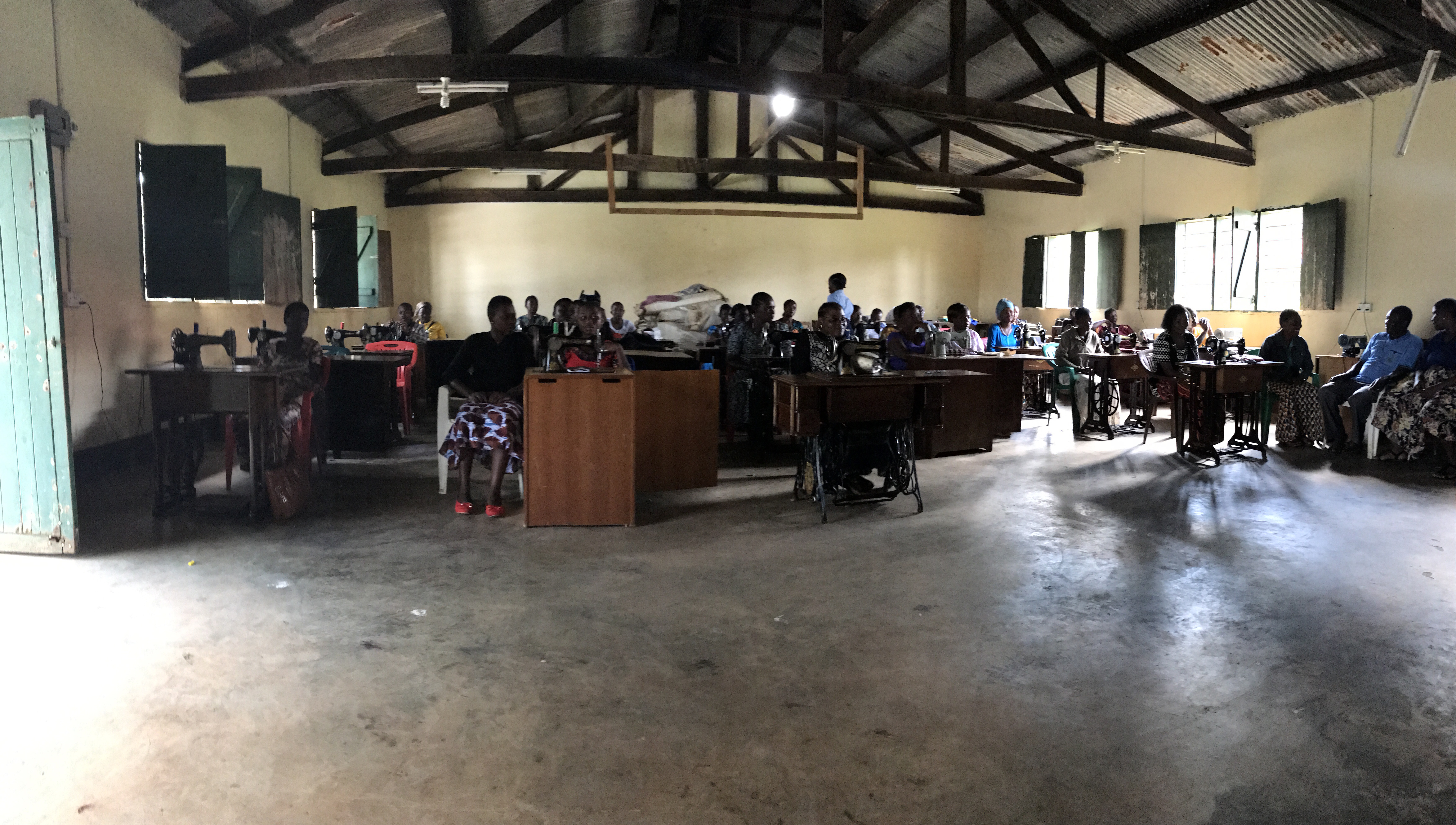 After breakfast, our entire group walked over to a large building on the diocese’s campus where we were to meet the women who wanted to learn to sew. As we passed an intermediate building housing the offices of the diocese’s Development Department, of which Fr. Matthew is in charge, a group of some 40 plus women singing joyful songs of welcome met us and accompanied us to the sewing shop singing and dancing along the way. It was a wonderful greeting. We got to shop to find some 40 plus sewing machines set up on work tables and more than 40 women eager to start learning what Jill, Christine and Eleanor could teach them about sewing.