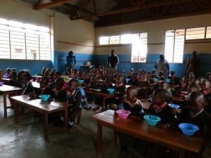 The schools feed the children. Here the children in the primary school are eating porridge in their classroom.