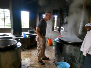 Floyd tours the kitchens and tells sister that she is doing it wrong because the firemen do it. The one pot was full of beans and maize. One room feeds the primary school and the 2nd room is for the secondary school.