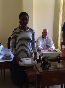 Tabitha with her gift and the sewing machine that Jill and Jay provided.