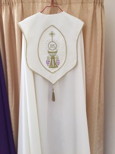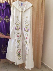 Fr. John and Denny spent the day together in Mwanza while the rest were on safari (See separate blog). After breakfast at the hotel they headed out. First stop was To meet Fr. Gerald to give him money to replace the pump at St. Aloysius school. After that was done, we headed to Mincon to return the Venturi and to thank them for their generosity and assistance. We then headed to Bujora where the Dimesse Sisters run a center called “Empowering Women Center.” They make vestments. Fr. John had seen a cleric the Fr. James Spahn has and wanted to see if he could get a similar one. Here is a sample of their work.